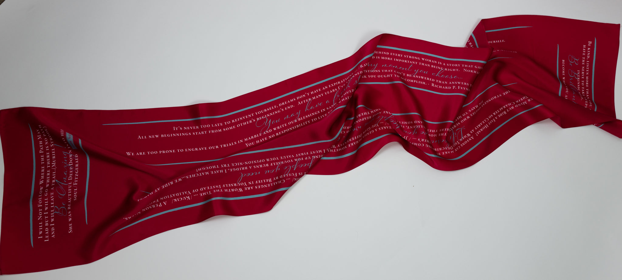 This lovely Burmese Ruby Red color scarf is from the new Threads of Wisdom II collection with new sayings and colors. The beautiful red is bright with aqua accents for 4-season wearing.