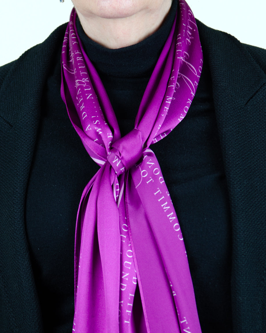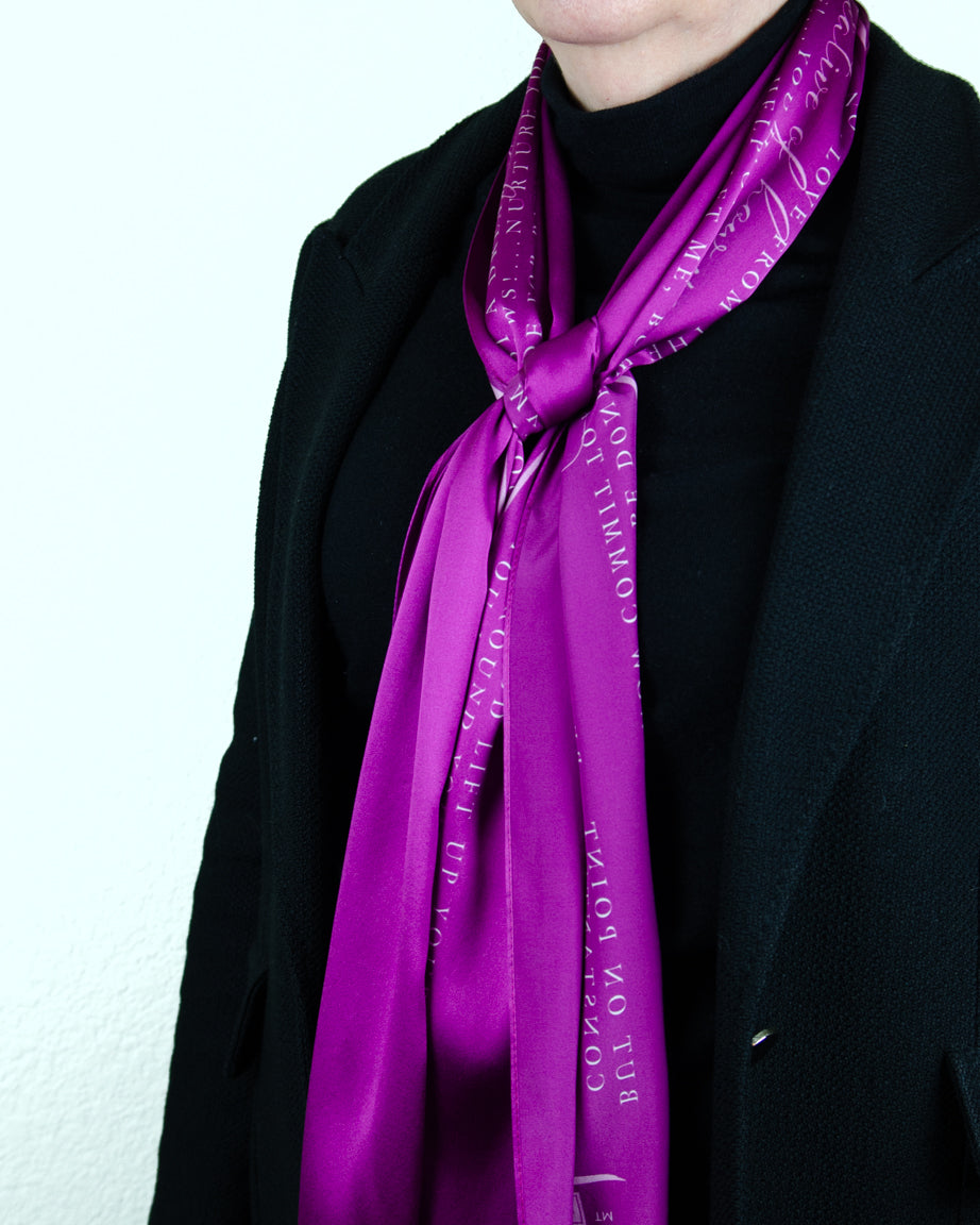This elegant long silk scarf in deep plum with light lavender lettering is the perfect accessory for your little black dress, a suit or with a comfy sweater and jeans any time of year. This adds the perfect touch to your wardrobe!